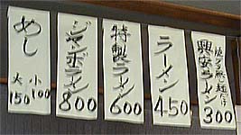 ▼このお店のメニューは5品(写真参照)しかありません。ギョーザもないというラーメン一筋の気合の入ったお店です。インパクトのあるチャーシューラーメンを食べたいと言う人にはお勧めのラーメン屋さんです。 ★お勧めメニュー:特製ラーメン\600 ▼休みが日・月・木曜日で、しかも休み時間もあるので気をつけて行きましょう。 *上記内容は2000/07/01の情報ですので変更されているかもしれません。